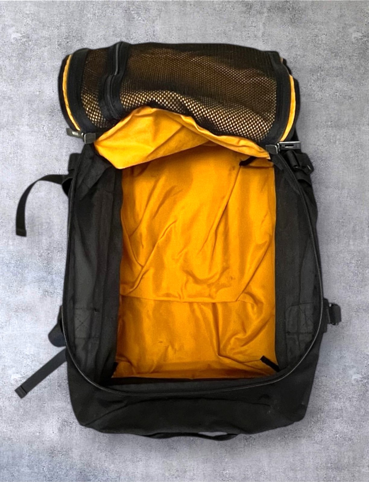 ★メインコンパートメントに1週間分の衣類を、独立した総裏地付きボトムコンパートメントにはブーツやギアを衣類と分けて収納できます。本体とボトムコンパートメントの仕切りはギアの大きさに合わせて調節可能。ジッパー式エンドポケットはすぐ取り出したいアイテムの収納に最適で、内側のメッシュポケットは洗面用具などの収納に便利です。